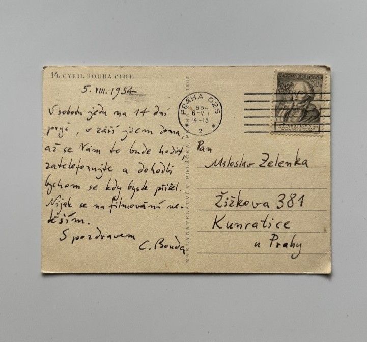 ručně psaná dopisnice Cyrilem Boudou pro Miloslava Zelenku
