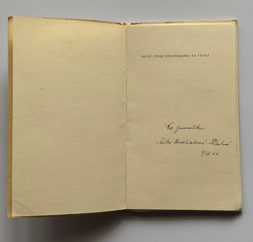 Úvod BIBLIOFILIE / PODPISY / VĚNOVÁNÍ / ČÍSLOVANÉ VÝTISKYMíla Bedřichová Šťastná. První česká knihtiskařka se vdává / PODPIS