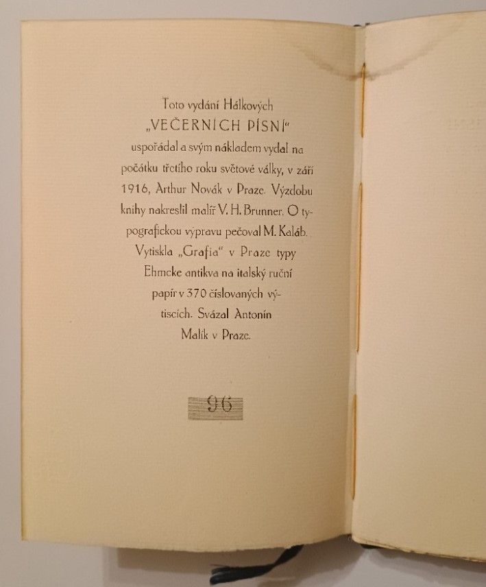 Úvod BIBLIOFILIE / PODPISY / VĚNOVÁNÍ / ČÍSLOVANÉ VÝTISKYVítězslav Hálek. Večerní písně / V. H. BRUNNER /1916